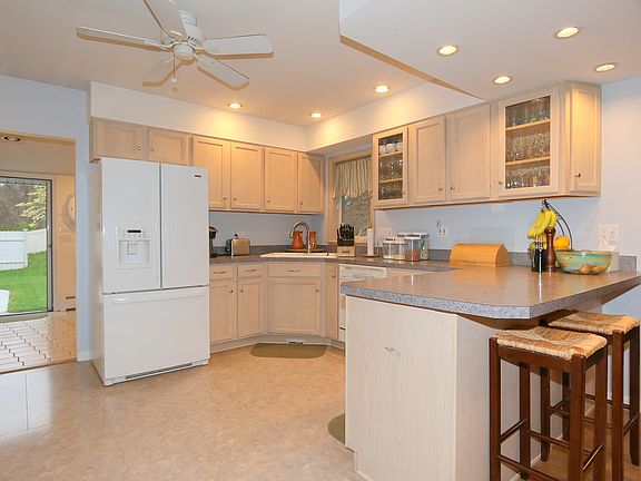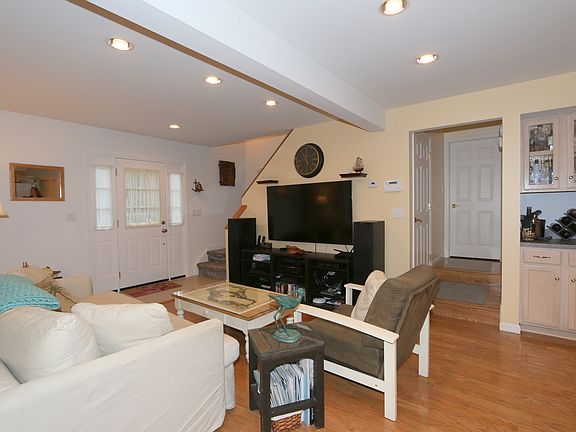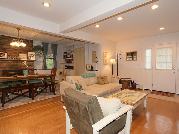 As you enter this charming renovated home, you are immediately impressed by the open floor plan, gleaming hardwood floors and welcoming dining room with a brick wall fireplace with wood burning insert. The open flow is perfect for entertaining and opens out to a level, fenced yard with a large patio surrounded by natural beauty. The first floor has a large master bedroom with vaulted ceilings, a private entry to the full bath and a walk-in cedar closet. Upstairs, the second bedroom and home office/den also have vaulted ceilings and attractive windows, allowing natural light to flood these areas with sunshine. The basement offers plenty of storage, a room for music or crafts, and access to the large two car garage with shelving and more work area. Bordered by woods to the rear, the yard is attractively landscaped with flowering bushes and plantings. Forget about a condo - come make this inviting home yours today!