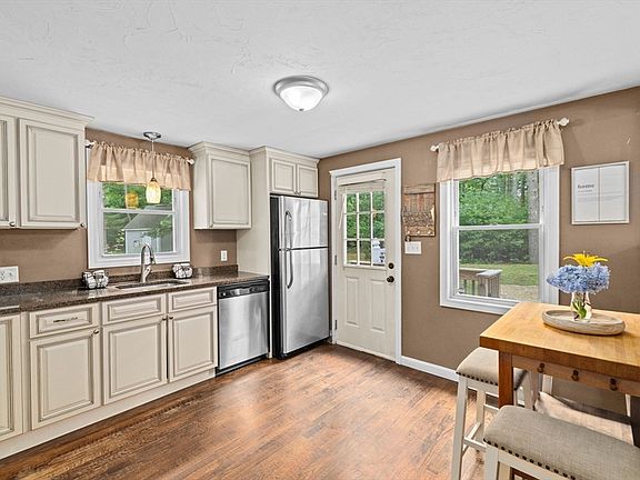 Easy living awaits at this meticulously maintained Ranch, nestled among acres of lush tree-lined land, surrounded by a private, grassy, level lot. Inside, the open concept style lives larger than life, featuring the beautifully updated kitchen w/granite counters, SS appliances, & antique white cabinets, which opens to the spacious living room. Two good-sized bedrooms, one beautifully styled with a shiplap accent wall, & the sunlit full bath completes the first floor. The partially finished lower-level offers a versatile living space w/ electric baseboard heat, perhaps an office, 2nd living room, hobbyist area, imagine the possibilities! There's no shortage of storage space throughout the rest of the basement. Welcome cozy gatherings on the 19x30 stone patio & firepit, perfect for entertaining! This turn-key home is move-in ready with major renovations in 2014, including all vinyl windows, roof, insulated doors, exterior walls insulated, septic, & water heater in 2023. A must see!