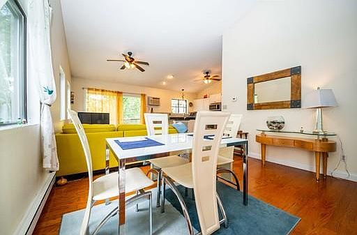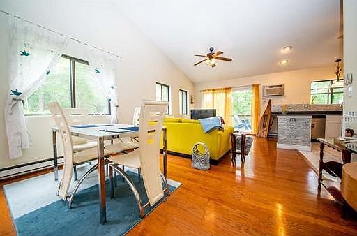 A hydrangea-lined walkway leads up to a Vacation Where You Live two bedroom, two full bathroom condo located in Sea Watch Village in Monument Beach, Bourne. It is easy to beat Cape Cod traffic, located just 3 miles to the Bourne Bridge, and only an hour commute to Boston and Providence. Short distance to Whistle Stop Ice Cream, Beckys Bakery, and Monument Beach. Very private large deck and yard accompanies a peaceful, breezy, bright home. Generous granite countertops in a modern kitchen, with a walk-in laundry and storage room. Spacious master bedroom has an updated master bath and large double closet. There is a cheerful second bedroom, which can also be used as a convenient work-from-home office space. Beautiful hardwood flooring, tile, and carpeting. Private end unit with all first-floor living accomodations. Move in for summer, enjoy the pool, and enjoy all the Cape has to offer all year round! See our video on YouTube.