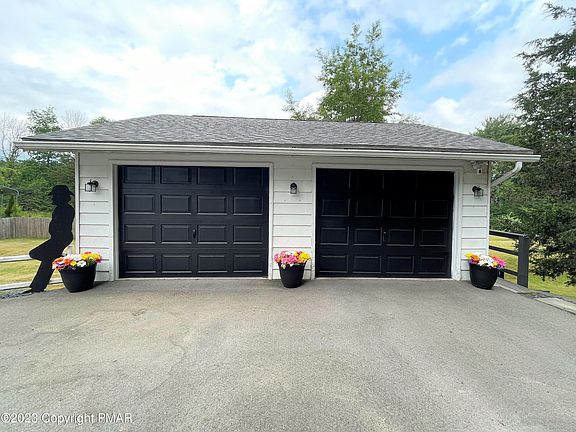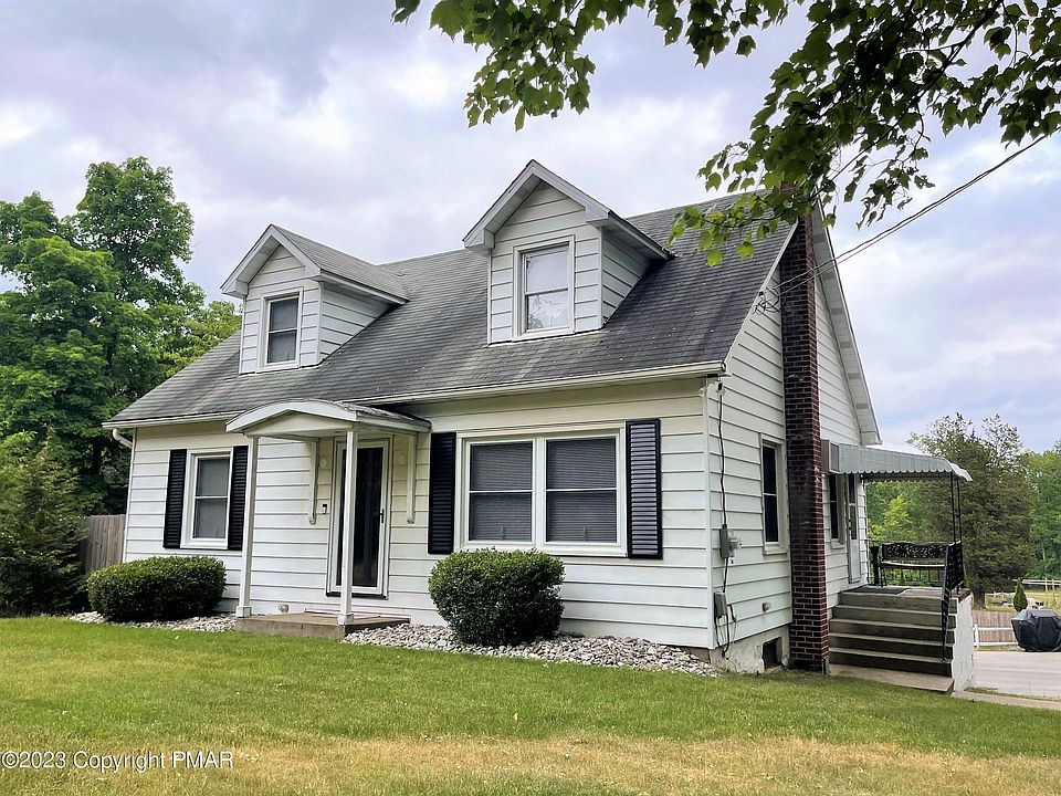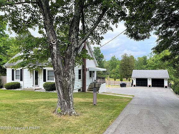 Charming Cape Cod home located in the heart of the Poconos. Set back from the road to offer total privacy, this home presents old world beauty with modern updates. The Owner's private suite is gorgeous tongue and groove knotty pine with full private bath, 2 closets and several sitting areas. The living room is a highlight with hardwood floors and a rustic rock built in TV/Electric Fireplace adding wonderful ambience. You also have a modern kitchen, and arched doorways enhance the pleasing look of the interior. All rooms are spacious. There is a built-in garage, and outside you have a 24 X 24 detached garage with storage beneath. The backyard is fenced green grass, perfect for a garden and pets. This home is NOT in a development. Close to all Pocono attractions. Cash or conventional only.