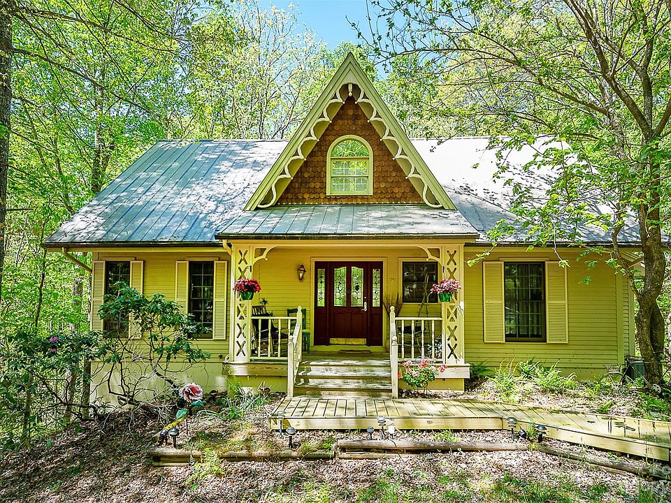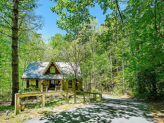 A fairytale Hansel & Gretel house awaits you in the enchanted forest. Nested in a quiet cul-de-sac, this cottage-style home showers you with amazing charm. Wide Pine plank flrs, vaulted Tongue & Groove wood ceilings, wood-burning fireplace, open loft plus rear Gazebo creates a one-of-a-kind mountain retreat. Main level Primary BR with access to the rear deck includes a WIC and ensuite bath having an antique vanity, jetted tub, stall shower and laundry closet. The eat-in kitchen features wood cabinetry, pantry, wood plank floors and breakfast area surrounded by windows for lots of natural light. A den and/or possible 3rd BR is adjacent to a convenient full bath on the main level. The fire-side Living Area enjoys soaring ceilings open to a 2nd story loft. The upper-level guest BR & bath offer privacy from the main living area. Ideal PartyRm/Game room in LL. New HVAC system installed in 2021, HWH replaced in 2022, new commode installed in main level guest bath in '22 & new gutters in '22.