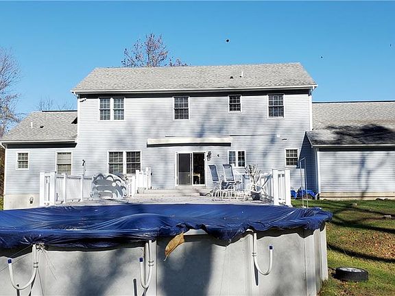 4 bedroom 3.5 bath colonial on 1.3 acres of peaceful tranquility. The level lot is partially wooded and on a cul-de-sac with shed and invisible dog fence. Oversized eat-in kitchen boasts natural maple cabinetry, granite counter tops and tile upgrades. Formal dining room has trey ceilings, family room with Harmon wood pellet stove. French doors lead to a formal living room and an en suite wing with another large bedroom and full bath. Second floor has 3 bedrooms and 4th bonus room for home office/den/nursery. Primary bedroom has two closets and an oversized bath with two vanities and a jacuzzi tub. First floor has 9 foot ceilings and hardwood floor upgrades. The unfinished full walk-out basement has high ceilings and roughed in plumbing for an additional bath. The 3 bay garage is oversized. Sliders off the kitchen lead to a huge two tiered maintenance free timbertech deck with a motorized retractable sunsetter awning that leads to a heated above ground pool. Standard STAR reduces taxes by $768.