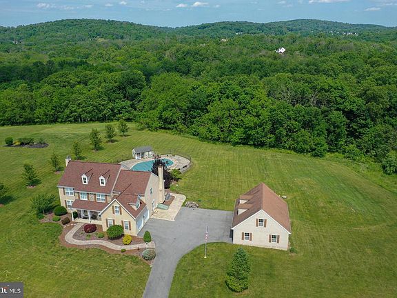 Beautiful 4 bedroom, 3 1/2 bath Single home on 3+ acres with in-ground pool in quiet community on cul de sac in the country featuring custom built stone and stucco 2 story colonial. This spacious 3,700 sq.ft home features a large two story entry foyer, formal living room with wood burning fireplace, formal dining room, gourmet kitchen with 42" Cherry cabinets, granite countertops, Stainless Steel appliances including refrigerator, D/W, double sink and double oven plus a third oven located in the island. In addition there is a dining area with French doors leading to the enlarged back patio. Featured on the main floor is the great room with cathedral ceiling, another wood burning fireplace and an open second staircase to the second floor plus a laundry and powder room. The second floor consists of four bedrooms with the master containing a sitting room plus a luxury bath and a loft overlooking the main foyer. Custom energy efficient shutters on all windows, the flooring is rustic 12" wide pine plank with ceramic tile in the kitchen and bath rooms. The lower level contains an additional 1,000+ sq.ft. of finished entertaining area and another bath room. In addition to the attached two car garage there is a custom built over-sized 1 1/2 story three car garage (30X36) with tons of storage on 2nd level, and an in-ground heated pool with pool shed/cabana. additional features include central vac, two separate propane hot air heating systems, central A/C(new in 2020), pet fencing with multiple collars, security cameras/security system with smart phone access, and more. Call today for your personal tour!