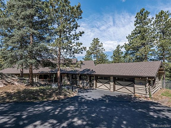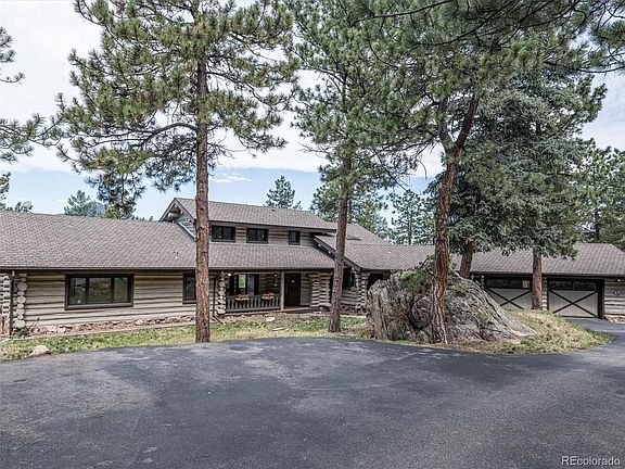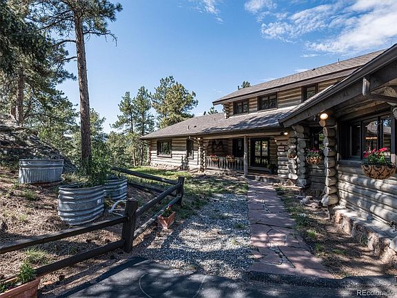 Welcome to West Ranch, a gated community of 52 homes situated on over 1000 acres. Five hundred acres are designated community open space with hiking and equestrian trails surrounded by stunning mountain views. This quintessential Colorado log home is located on over 15 acres of meadows, rock outcroppings, and mountain vistas, with the utmost of privacy. Offering a true mountain respite, yet conveniently located within 35 minutes to Denver. The kitchen has been updated with granite counter tops while keeping the rustic cabinetry and brick flooring to compliment the log design. Spacious great room comes complete with vaulted ceiling, massive log beams, stone fireplace, large windows capturing the views and easy access to the covered patio as well as the deck with swing. Large main floor master suite has adjacent private office or reading room with views. The upstairs loft can be used as a guest suite or office as it has an adjacent full bathroom. The lower level has a bedroom and ¾ bathroom with a non-conforming 4th bedroom, office or extra storage. Two stall barn with hayloft, fenced pasture and corral for the horse enthusiast or a great place for a dog run and extra storage. Truly a rare find!