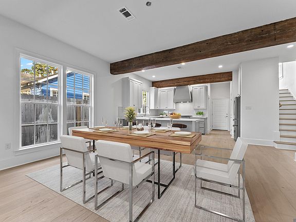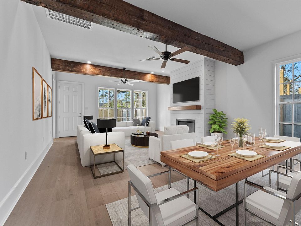 740 Acadia Street features a beautifully designed new construction home offering approximately 2,000 square feet of modern living space. This 3-bedroom, 2.5 bath residence boasts soaring 10-foot ceilings, hardwood floors, and an open-concept living area highlighted by a fireplace and large decorative beams that add warmth and character. The kitchen is equipped with high-end appliances and a spacious island, ideal for barstool seating and entertaining. The primary bedroom is conveniently located downstairs and features a large walk-in closet and a luxurious primary bath with a large shower and a separate soaking tub. Upstairs, you'll find two additional bedrooms and a full bath, providing comfortable accommodations for family or guests. The front entrance boasts an outdoor kitchen and a dedicated entertaining area, perfect for gatherings. At the rear of the home, a large porch overlooks a versatile outdoor space ideal for pets, gardening or additional entertaining.