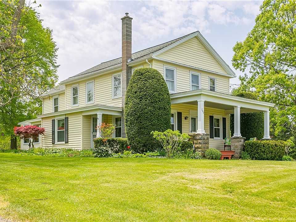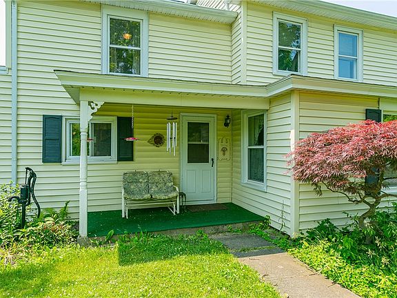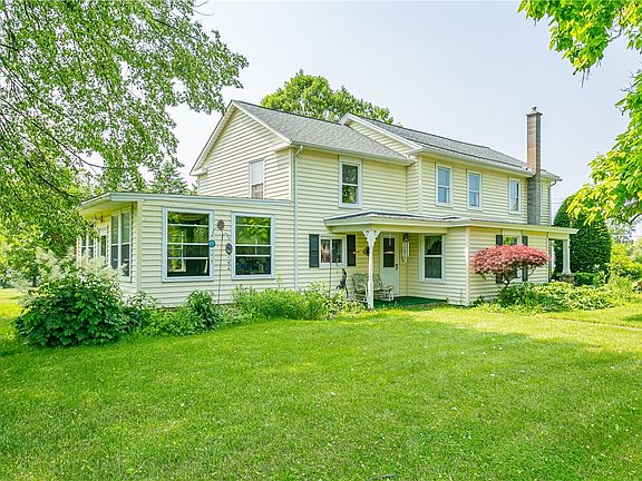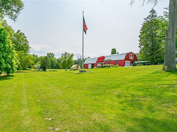 Welcome to the Ponderosa! This 11.5-acre property includes a charming 2062 sq. ft. vinyl-sided 3 bedroom, 1-1/2 bath home. It features an eat-in country kitchen and 3 porches, including a large screened-in back porch. The property also includes a 2-1/2 car garage with a big attached workshop, a greenhouse, and two sizeable block-wall barns with metal roofs. One barn has two large horse stalls (birthing) and a full-size hay loft. You’ll enjoy the serenity of this property with its woods, two pastures, stocked pond and stream. Easy commute to Rochester, Penfield, and Webster. Delayed Showing starting on Thursday 6/29 at 10:00AM. All offers to be reviewed Mon 7/3 at Noon. CHECK OUT THE AERIAL DRONE VIDEO!