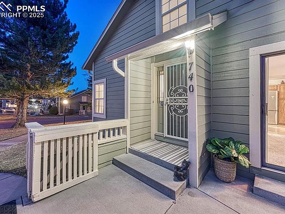 You'll find 740 Crown Point Dr. tucked in a quiet street with beautiful mature trees at the foot of Cheyenne Mountain. It starts off with a bang - a charming shaded front porch with amazing mountain views - just imagine having your morning coffee here! As you enter you are greeted by warm, recently refinished hardwood floors throughout, soaring ceilings bathed in light and a cozy gas fireplace. The kitchen has gorgeous granite countertops and a big island with a slide in range; BRAND NEW REFRIGERATOR with beverage center and newer DISHWASHER. The kitchen has tons of storage, including a large pantry and lots of organized pull-out cabinets. The dinning room, next to the kitchen also has a lot of natural light and is open to the living room and kitchen. Main level living at its finest with one bedroom and bathroom downstairs and another bed and bath upstairs. The lower level bedroom has a walk-out sliding glass door to the front porch with 4 panel plantation shutters so you can change how much or little light you want. The loft space is special because it's full of light and fairly large - the opportunities are endless. The upstairs bedroom with en suite offers the same stunning mountain views as the front porch. ALSO, newer AC! All in all, you'll love this cozy, quiet townhome in award winning Cheyenne Mtn. School District. It's close to shopping and dining, exceptional trails and Cheyenne Mountain State Park just minutes away. Fort Carson and Pikes Peak State College are less than 10 minutes away as well as I-25. Come check out your next oasis.