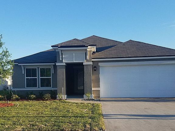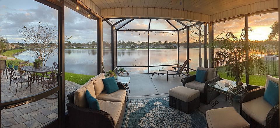 Added improvements/updates include ceiling fans in each room, full house gutters, full lawn irrigation system with well, robellini palm trees, finished epoxy garage floor, smart wi-fi thermostat, Wyze camera doorbell, all new carpeting in bedrooms, laundry cabinets and an extended 12X20 screened lanai and adjacent 21x13 paver brick patio which offers a spectacular south-facing lakeview. This backyard is an oasis for relaxing, watching sunrises/sunsets and entertaining!
