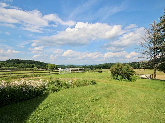 Rainbow’s End Farm features a C. 1811 brick cape with 1985 wood frame ell and attached garage, lovely long-range views into NH, a 9-stall barn, and 73.9 acres of designated prime, organic agricultural and forest land. The residence includes 5 bedrms and 4 baths, 4400 sq feet of finished space, wide pine + hardwood floors, multiple fireplaces and family room wood stove. The cook’s kitchen has modern amenities with stainless, granite and cherry. The large master suite has its own wood stove and includes a bath with jetted tub, office, and a deck overlooking the farmland and views. There is an antique soapstone sink in the mud room, as well as a small working sauna. Established perennial beds, raised garden beds, stands of raspberries, and a rhubarb patch surround the house. The barn has excellent lighting, a heated tack room, ample space for storing carriages and hay, and frost-free water. A small fenced ring is adjacent to the barn, with a 40X100M grass riding/driving dressage ring nearby. Previous owners hosted a successful horse driving trial. Approximately 30/40 acres of the open land is flat to gently sloping. The balance of the acreage is wooded, ensuring protection of the long-range views. No herbicides or pesticides have been used on the property in over 30 years. A deep well provides an excellent water source. First time on the market in 32 years, the property is 10 minutes from I-91 and has unlimited potential for B+B, a wedding-event venue, or Air BnB.