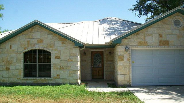 Beautiful, unique designed, Native Rock Home with metal roof. Almost new, built in 2009, 4 bedrooms, 2 baths, 2-car garage with double insulated doors. Home was built with many energy-saving features in mind. Foam insulation, insulated windows, etc. are just a few of the features. Split bedrooms arragement, the Master bedroom with French doors and walk-in closet, Master bath has separate shower and whirlpool style tub. Other three bedrooms and bath located on opposite side with wood blinds. Ceramic tile throught out with arch designed tile at entrance. Different ceiling designs enhance the appeal of this wide open living/dining/kitchen area. Kitchen has breakfast bar, pantry and cabinets galore!!! Lg. corner lot with trees, curb-appeal. Must see to appreciate, so much for so little!