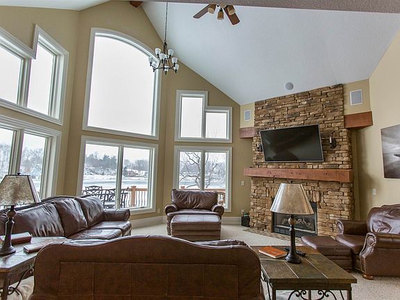 Experience lake living at its best in this custom built lake home with 86' of frontage on the Lake James Chain! The home was originally constructed by the builder as his personal residence. This home won the 2007 Builder's Parade of Homes. "Castello di Lago" - Castle by the Sea, as it was named, evokes an understated Tuscan flare while the winning design takes advantage of the lake lot to create an elegant yet comfortable living space. A custom Cherry door with transom windows sets the tone for what you can expect as you go thru the home. Entering the two-story foyer you will catch your first glimpse of the lake. Travertine floors lead you into the Great Room that has a beautiful stone fireplace as the centerpiece of the main level. It is adorned with a rustic oak mantel which is replicated in the beams that are found throughout this floor. A formal dining room sits just off the foyer. This is a perfect space for more formal entertaining with wainscoting, hardwood floors, and custom draperies that frame the space for an intimate feeling. Some of the best views can be found in the custom kitchen & octagonal breakfast nook- creamy maple glazed cabinets, two-toned island, and top of the line appliances are perfect for the chef in the house! Saving the best for last, the main level master suite takes advantage of the sunset lake views while the spa inspired bath will pamper you whether you prefer to unwind in the large soaking tub or enjoy a good hot shower. You can watch TV from both! The room is topped off with His/Her vanities, large walk in closet, and stone tile floors. Upstairs there are two private bedrooms with full bath plus a bonus room- perfect for guests. There is a finished basement that has a large family room, office, full 2nd kitchen, additional guest bedroom, & full bath. Custom bookcases, and crown molding, are a few of the special details on this level of the home. There is also unfinished storage/mechanical room plus a large lake storage room- perfect for all the lake toys. A covered patio is another space to take in the views- perfect spot for the hammock!