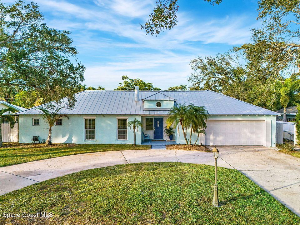 Sweeping river views from the circular driveway set the tone for this 5-bed, 2.5-bath pool home that effortlessly blends coastal charm w/ retro character. Step through the mid-century modern entry into a space highlighted by polished terrazzo floors & a dream kitchen, featuring quartz countertops, a tile backsplash, soft-close cabinets, SS appliances, & two pantries. The split floor plan offers spacious bedrooms, two inviting living areas, & a primary suite with new sliders leading to the patio. Recent upgrades include a seamless metal roof, fresh exterior paint, a 2022 AC, & impact-rated or double-pane windows throughout. Step outside into your own personal slice of paradise, complete with a resurfaced screened pool & deck, perfect for basking in the sunshine or hosting gatherings under the covered lanai. Situated at the end of a quiet dead-end street with no-HOA, this home provides both privacy & convenience, just a short walk from the river, restaurants, and top rated schools.