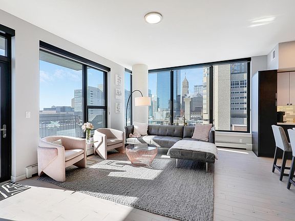 Extended islandEngineered wood flooringChic and stylish kitchenPantry with pull-out drawersPanoramic views of downtownCorner unitSpacious bedrooms