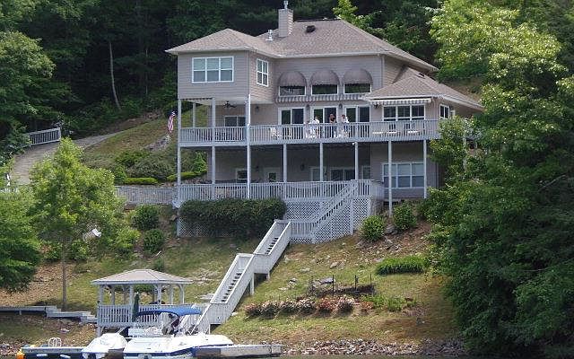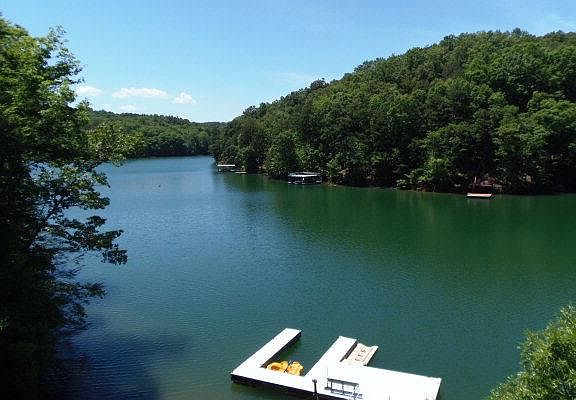 Just Bring Your Boat!.Light, bright, and airy, this spacious home gives you a dock with two boat slips, gazebo, and fire pit, over an acre of land and thats only the beginning. Feast from the gourmet kitchen with huge walk-in pantry; entertain lavishly in an open great room with soaring ceiling, fireplace, hardwood floors, and gorgeous built-in cabinetry. Cozy up to the master bedroom fireplace, or linger in the sitting nook with lake views. Guests will love the lower level wet bar, entertainment center, bedrooms, and den. Two decks accommodate indoor/outdoor activities day or night. Park in the two-car attached garage.