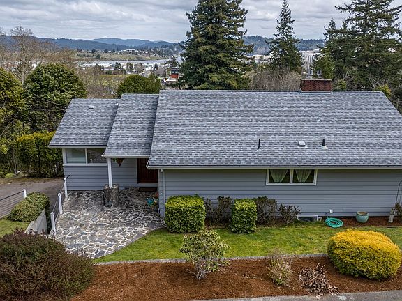 Tranquil Views of the Bay and surrounding Nature! The best of both worlds with both "town" and "country" amenities. 2 Tax lots featuring a spacious yard, stamped concrete patio and more - tucked into an incredible, hidden location! This dead-end street is just blocks from downtown Coos Bay and minutes to hospital, Mingus Park, ocean beaches, hiking, and more! This beautifully maintained Day-Ranch features all living needs on the main level. Primary Suite boasts gorgeous Cherry hardwood floors, Built-ins, Soak-tub, Heated tile floor, walk-in tile shower, and an incredible custom dressing room with vanity and gorgeous cabinetry. Powder Room off the main living area, dining room with a deck and a view, and a spacious kitchen! Lower-level features 2 Bedrooms, remodeled bathroom, family room (with dinette), and access to lower patio. The combined area of the 2 tax lots is approximately .68 acre. You'll be hard pressed to find a package like this one- call today!