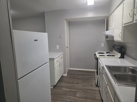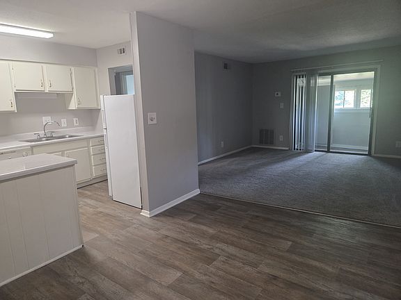 This unit offers a bright and welcoming kitchen with a white and cream color scheme, white appliances, and solid surface countertops. It has an open layout and includes a pantry for extra storage. The flooring is a mix of vinyl in the kitchen and dining areas, and soft carpet in the living room and bedrooms to keep things cozy. The main bathroom features a clean white and gray design, with a tub/shower combo and a modern white sink. Washer and dryer hookups are located in the shared community laundry area. The primary bedroom comes with its own bathroom and a walk-in closet with built-in shelves. The second bedroom has a good-sized closet with space-saving bi-fold doors, so you can make the most of the room. Residents are responsible for all utilities, including water, sewer, and electricity. A minimum security deposit of $300 is required. Rent is due between the 1st and 5th of each month