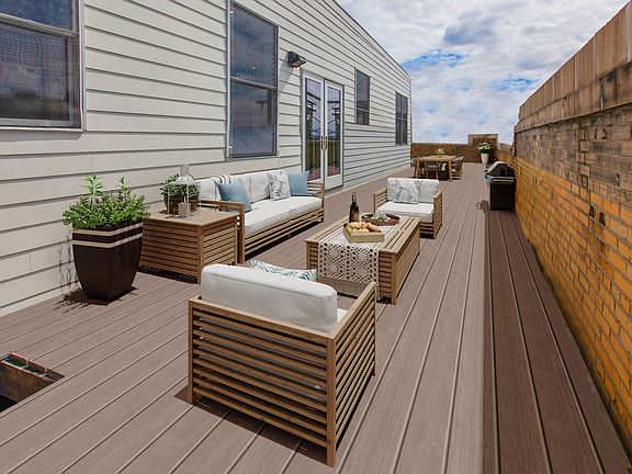 The living room leads you to a wrap around deck that has space for many many of your lucky guests to enjoy NYC's gorgeous sunsets year round!
