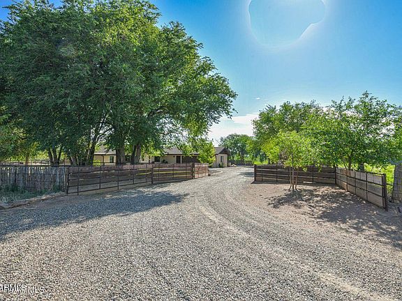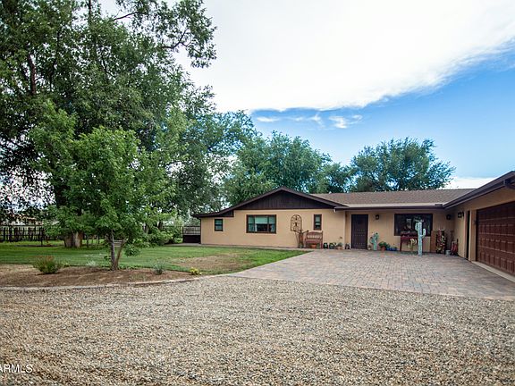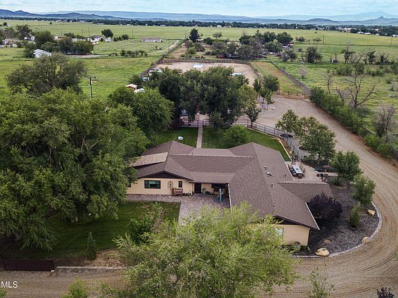 ATTENTION EQUESTRIANS and ROPERS - Step into this one-of-a-kind oasis in the heart of Chino Valley and find the 4.15 acre horse property that you've been looking for. Use the horse facilities for your own needs, or as INCOME potential by boarding horses for others! This well-kept secret lies at the end of a gravel lane PRIVATELY OWNED BY YOU. Mature trees, manicured lawns and pride of ownership await you here. Through the front door, you will find a custom floor of gorgeous red pavers that has been sealed to ensure an easy-clean environment. On one side of the home you will find your 3 bedrooms - including the master and 2 walk-in his and hers closets (plus a bonus exit to the back yard from the master.) The large living room includes gorgeous picture windows and leads to a comfortable kitchen with breakfast bar and dining room as well as pantry and mud-room. Pass through the kitchen and into the laundry room with a convenient 3/4 bath and plenty of counter, cabinet, and closet space for all your needs. Continue through the Laundry room and into the oversized garage that is plenty large enough to fit your truck and has large storage cabinets. Off of the garage is a "pump room" and a phenomenal office, workout, or flex room that is climate controlled and the perfect size to turn into anything you need it to be. The spacious property ensures you have plenty of room for all your toys and hobbies, especially if having a private well and gorgeous, pipe-fenced horse facilities is appealing to you! With a round pen, roping arena, and meticulous barn fully equipped with 6 concrete-walled stalls to ensure minimal damage from frisky horses, tack room for easy organization, and covered hay/feed storage. The second level is accessible by a pull-down ladder. As an added bonus, the home comes with 2 fully functioning A/C units and a new roof as of 2018. Don't overlook the value of complete RV hookups and a bonus shed for your gardening or yard tools and equipment.