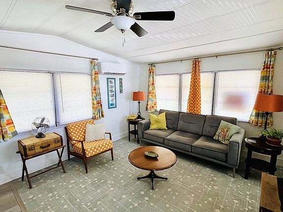 Beautifully Updated 1968 Park Mobile Home in Isle of Palms 55 Plus Community This tastefully updated 1968 Park mobile home showcases decorative designer and architect-inspired features throughout. Located in the highly sought-after Isle of Palms Mobile Home Park, a welcoming 55 plus community, this one bedroom one bath home offers comfort, style, and functionality. The exterior features a durable metal roof, metal vinyl siding, exterior metal gutters, white exterior with orange trim accents, a 12x17 carport with room for one vehicle, and an 8.5x2.5 storage shed. Climate control is efficient with two Mr. Cool Wi-Fi mini splits that are only three years old, along with a GE wall AC unit. The home also includes a three-year-old tankless water heater and an updated electric panel. Inside, the living area offers a cathedral ceiling with ceiling fan, carpet flooring, blinds, panel walls, and soft panel ceilings throughout. A bonus room provides additional flexibility, making it ideal for an office, hobby space, or guest accommodations. The kitchen features custom unique cabinetry, a Kenmore refrigerator, Maytag stove, a 2x2 pantry, vinyl plank flooring, stainless steel sink, butcher block countertops, panel walls, and a soft panel ceiling. The master bedroom includes carpet flooring, a custom ceiling fan, panel walls, soft panel ceiling, curtains, and a standard his-and-hers 2x4.5 closet. The master bathroom offers vinyl plank flooring, a tile shower with stainless steel handles, porcelain tub, porcelain sink, Formica countertops, panel walls, and a soft panel ceiling. Flooring throughout consists of carpet in the living room and bedroom and vinyl in the kitchen and bath. Blinds are installed throughout the main living areas. Isle of Palms Mobile Home Park Amenities Residents enjoy access to a community clubhouse, heated swimming pool, shuffleboard courts, organized activities and social events, well-maintained grounds, and a pet-friendly environment. The park is conveniently located near shopping, dining, medical facilities, and the beautiful Gulf Coast beaches. This stylish and well-maintained home is move-in ready and offers exceptional value in an active and friendly 55 plus community.