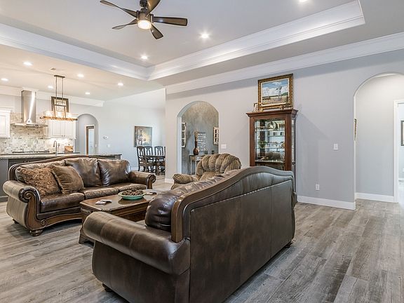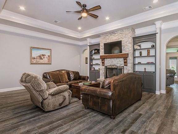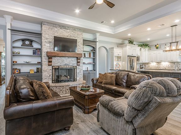Custom home with impeccable choices sitting in the middle of a stunning lot at River Falls. This home features an open floor plan including kitchen, dining room, formal living room with stone fireplace. Kitchen offers double ovens, custom vent hood, stainless dishwasher, 36'' gas cooktop, large island, and a walk in pantry with ice maker. Isolated master bedroom has a bay window with views of the canyon, a large on suite with a stand alone tub, walk in shower, double vanities, and a large walk in closet with builtin dressers and custom bench. Isolated second bedroom with private bathroom has a large walk in closet. Bedroom 3 & 4 share the full hall bath. Game room offers more living space with a half bath. Outdoor kitchen area leads to exterior with spectacular views.