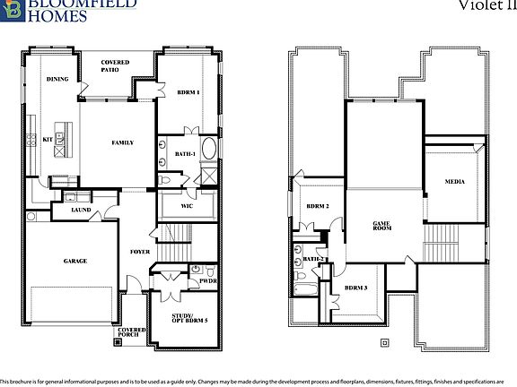 The Classic Series Violet II floor plan is a two-story home with three bedrooms and two and a half bathrooms.. Features of this plan include a covered patio, large family room with a soaring ceiling, study, open kitchen with custom cabinets and island, media room, game room; and a downstairs primary suite with a garden tub, separate shower, and a walk-in closet. This plan has the option for another bedroom and full bath at the study. Contact us or visit our model home for more information about building this plan.