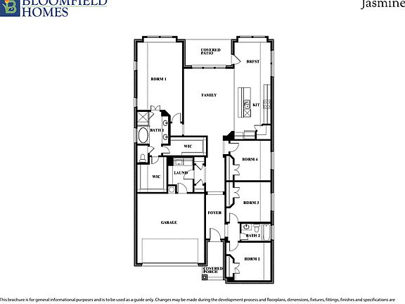 The Classic Series Jasmine floor plan is a single-story home with four bedrooms and two bathrooms.. Features of this plan include a covered porch, large family room, open kitchen with custom cabinets and island, and a primary suite with an ensuite bathroom, walk-in closet, and garden tub. Contact us or visit our model home for more information about building this plan.