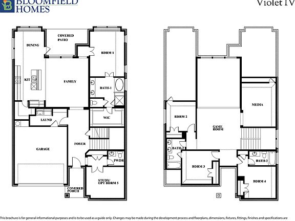 The Classic Series Violet IV floor plan is a two-story home with four bedrooms and three and a half bathrooms.. Features of this plan include a covered patio, large family room with a soaring ceiling, study, open kitchen with custom cabinets and island, media room, game room; and a downstairs primary suite with a garden tub, separate shower, and a walk-in closet. This plan has the option for another bedroom and full bath at the study. Contact us or visit our model home for more information about building this plan.