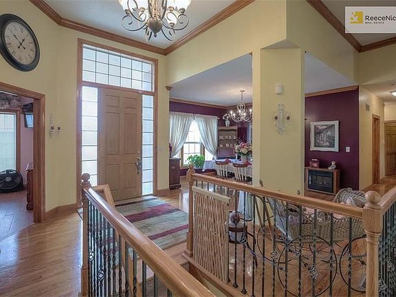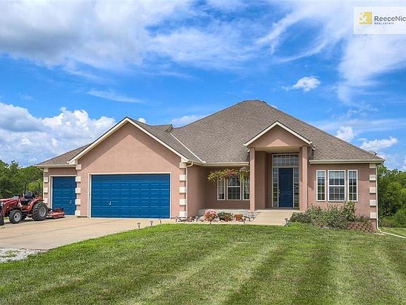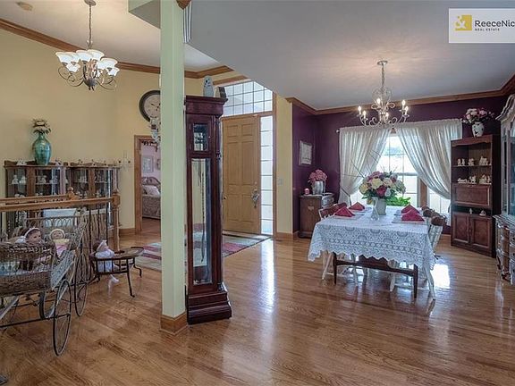 BEAUTIFUL REVERSE 1.5-STORY ON 10 ACRES. No Subdivision Restrictions! Wheelchair accessible has elevator to basement. See-thru fireplace in Kitchen/Great Room. Double pantry, island kitchen. Possible 5 bedrooms, 3.5 baths. Great place for entertaining. Lots of privacy. Family room is huge! Walk out to covered patio and pool. Small creek in back of property. Pond is split with neighbor; seller owns approximately a 1/3 of pond. 26'x32' deck frames 24' round 4' deep above-ground pool. Bar on pool deck.