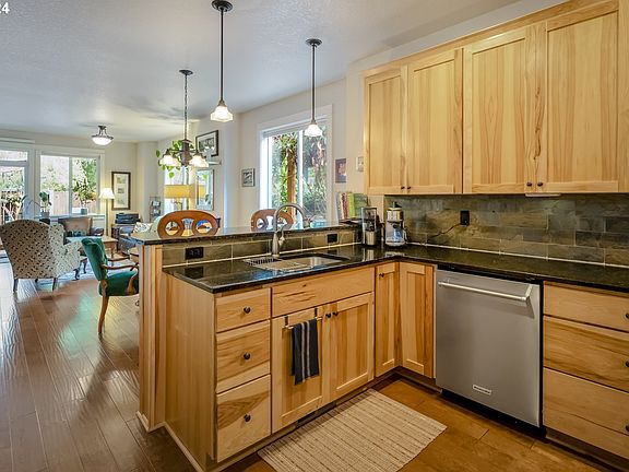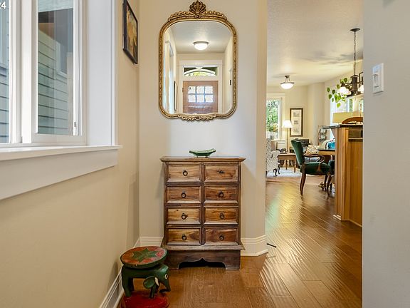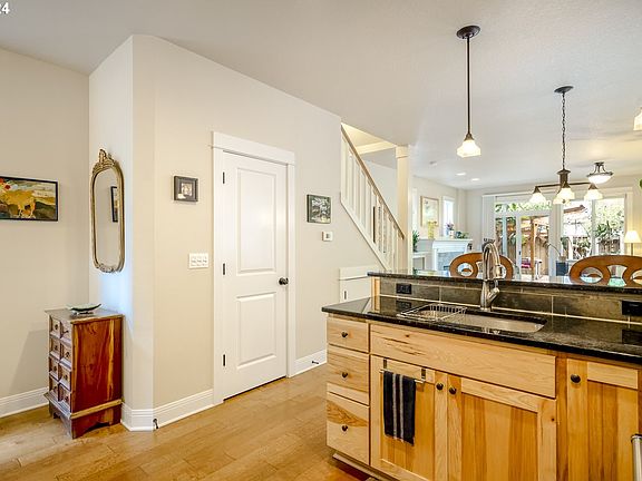 Nestled on a quiet corner lot in the sought-after University Park neighborhood, this beautifully maintained home offers both tranquility and convenience. Built in 2013, it features an open floor plan with an inviting, light-filled living space and a private, fenced outdoor area—perfect for relaxation and entertainment. The main floor boasts hardwood floors, a cozy gas fireplace, and elegant built-ins, with granite countertops in the kitchen. Upstairs, you'll find a large ensuite primary bedroom, a library/family/sitting room, and a convenient second-floor laundry room. The second bedroom also enjoys great natural light, while the third-floor bedroom/den/office provides treetop views that make for a serene workspace or retreat.With nearby amenities including New Seasons, Fred Meyer, Cathedral Coffee, and various local restaurants and taverns, this home is perfectly positioned for easy modern living. Additional features include a covered patio, an attached garage with storage, high-quality finishes, and thoughtful design touches. [Home Energy Score = 8. HES Report at https://rpt.greenbuildingregistry.com/hes/OR10194808]