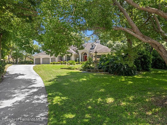 Satisfactory 4 Point inspection was done on the home! Luxurious and spacious 2867 sqft residence nestled in the exclusive Lake-In-The-Woods community, boasting 4 bedrooms, 3 full baths, and a desirable 3-car garage. Crafted in 1991 by esteemed builder Dobson Custom Homes, this sanctuary offers ultimate privacy. Nestled within lush landscaping, this home features a tranquil enclosed pool with a rejuvenating Jacuzzi hot tub. An extended covered lanai and small gardening area create a serene outdoor oasis on the .54 Acre Lot. Admire the majestic 3-tier imported fountain in the front yard, adding a touch of splendor to the property. Inside, discover a sunken living room with a cozy fireplace and soaring ceilings, creating a warm and inviting atmosphere. The formal dining room showcases an elaborate coffered ceiling, perfect for hosting elegant dinner parties. Retreat to the luxurious master suite, complete with a private den, expansive walk-in closet, spa-like soaking tub, and separate toilet room with a bidet. Two separate stand-alone vanities with ample bright lighting provide a pampering experience fit for royalty. Indulge in the lavish lifestyle offered by this exquisite Lake-In-The-Woods estate, where luxury meets tranquility. All located in this lovely gated community in Florida's Hernando County. Close to the Gulf of Mexico, local businesses, and hospitals, this neighborhood offers charming lakes and modern homes with spacious backyards. Enjoy 24/7 staffed, gated access and amenities like tennis courts, a dog park, and more. Spend time fishing, picknicking, or playing at the community library. Discover the magic of Lake in the Woods - your oasis in Florida. Call now to schedule your showing and make an offer today!!