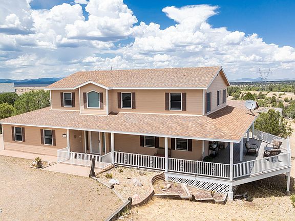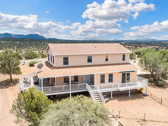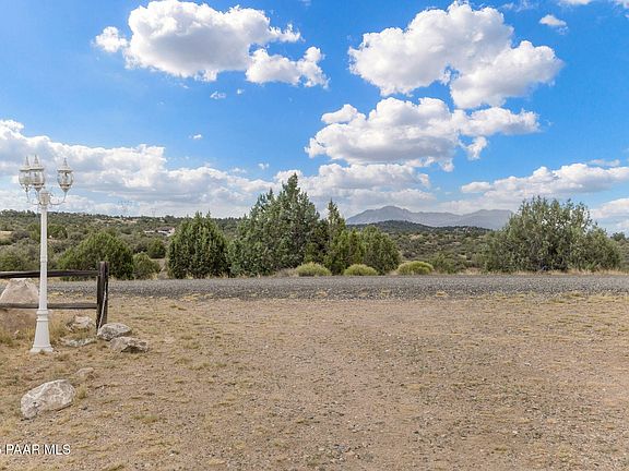 Escape to tranquility in this stunning custom ranch-style home, perfectly nestled on just under 5 acres, only 30 minutes from downtown Prescott. This spacious 2,544 sq.ft., PRICED TO SELL retreat features a large wrap-around porch, ideal for savoring your morning coffee while soaking in breathtaking sunrises and unwinding with picturesque sunsets. Inside, the expansive floor plan offers ample room for hosting and housing family and friends, including the convenience of main-level living with a bedroom and bathroom on the bottom story. For added convenience, the single-car attached garage includes a 10.5 by 5.5-foot storage area, perfect for a mudroom, yard supplies, mountain bikes, and more. Need more space? The detached 1,200 sq. ft. 3-bay garage, just a short stroll from the main...