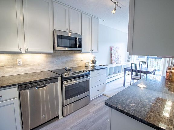 One of the premier units in this building - updated top to bottom, 3rd floor end unit, gorgeous kitchen with granite & white cabinetry, barn doors, 2 huge decks overlooking trees. Private storage room right outside unit, in-unit laundry & garage stall located right by entrance to elevators. Outdoor pool. Absolutely stunning! Super location too!