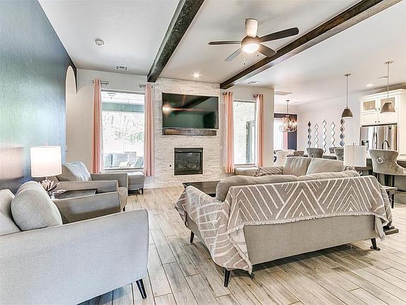 ***Inside: you'll notice the flow of the floorplan is masterful. The open kitchen and living area create a breezy vibe, perfect for hanging out or just living your day-to-day life. Need a quiet space to work or study? There's a private office just for that. This beauty features 10-foot ceilings, giving it that extra touch of grandeur. Inside, you'll find a loft with another bedroom and bath, perfect for guests or your own private getaway. The garage features a tandem 3+ car space and ELEVEN person storm shelter! A must see!!!