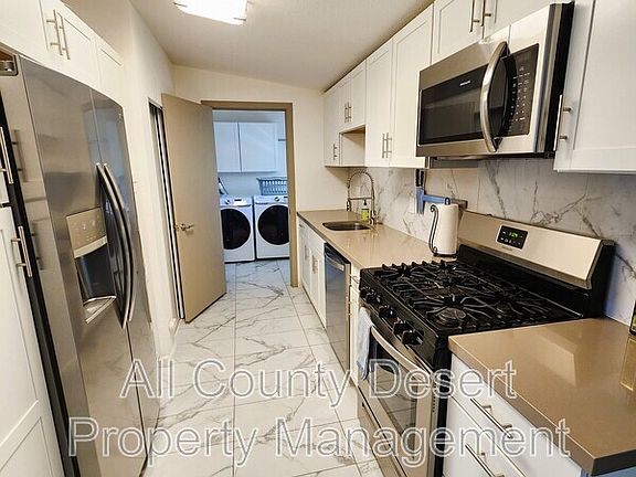 Central Palm Desert location near El Paseo Shopping District, Community College/Schools, Parks, Dining, Groceries, and more! This beautiful 3 bedroom 2 bath unfurnished home features an open living/gathering room, tile flooring, ceiling fans throughout, spacious dining room, kitchen island, all stainless steel appliances such as microwave, dishwasher, and refrigerator included! Master bedroom has carpet flooring, large walk in closet, and a modern tiled shower. Step through sliding doors into your large backyard, with a Ficus fence for privacy and a shaded porch. In unit laundry room with washer and dryer included. Two car garage and spacious driveway for extra parking needs. Tenant to pay all utilities. All applicants must pass a comprehensive background screening including income verification and landlord references. Renter's insurance is required. All applicants must have the following: monthly income of at least 2.5 times the monthly rent, no prior evictions, good rental history, and an acceptable credit score. If you see this home advertised online for less than the rental amount quoted here, the ad is a SCAM. We are the only authorized agent for this property. Please email us a link to any bogus or fraudulent ads so we can report it to the appropriate authorities. Please do NOT send money to anyone who offers keys in exchange for a deposit check - especially if they are out of state. When in doubt, please feel free to contact us.