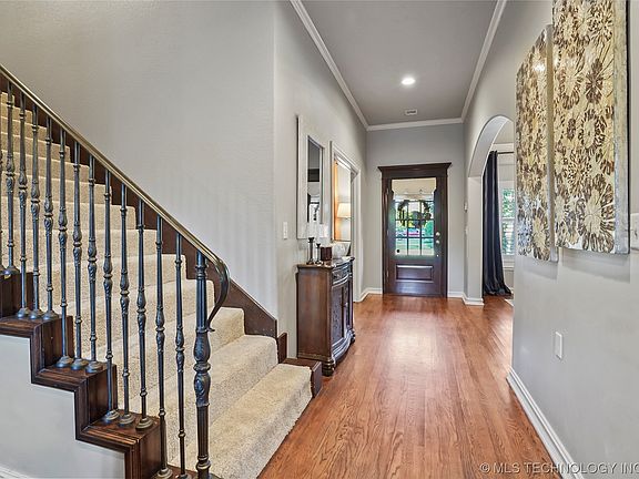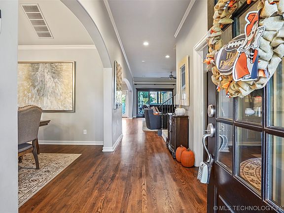Gated Ashton Hollow subdivision in beautiful South Tulsa, located in desired Jenks Schools, This house features wonderful updates throughout, including paint and carpet, with wood floors down. Large windows in the living room overlooking the back porch. The Kitchen counters are Perla Venata Quartz, perfect for gatherings dedicated dining area, and the Master suite, with a soaking tub, free-standing shower & marble in all baths. Plus game room and additional bedrooms are all upstairs. Close to shopping, grocery stores, restaurants, and more with quick access to HWY 169. Partial French Drain and a sprinkler system. Don't miss this!