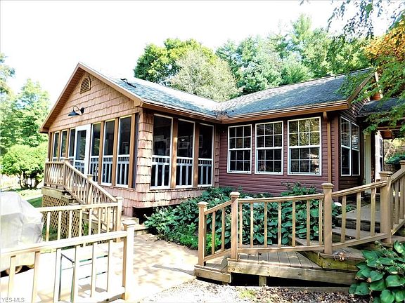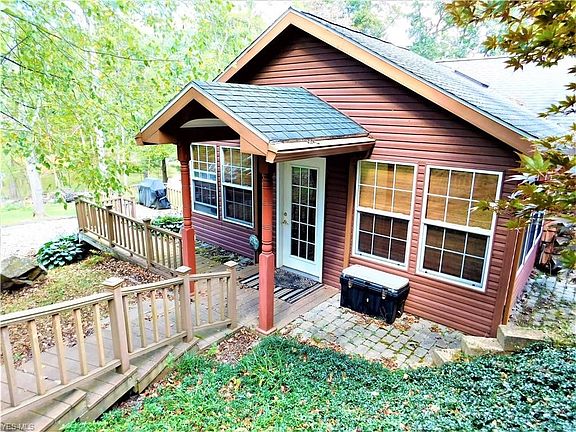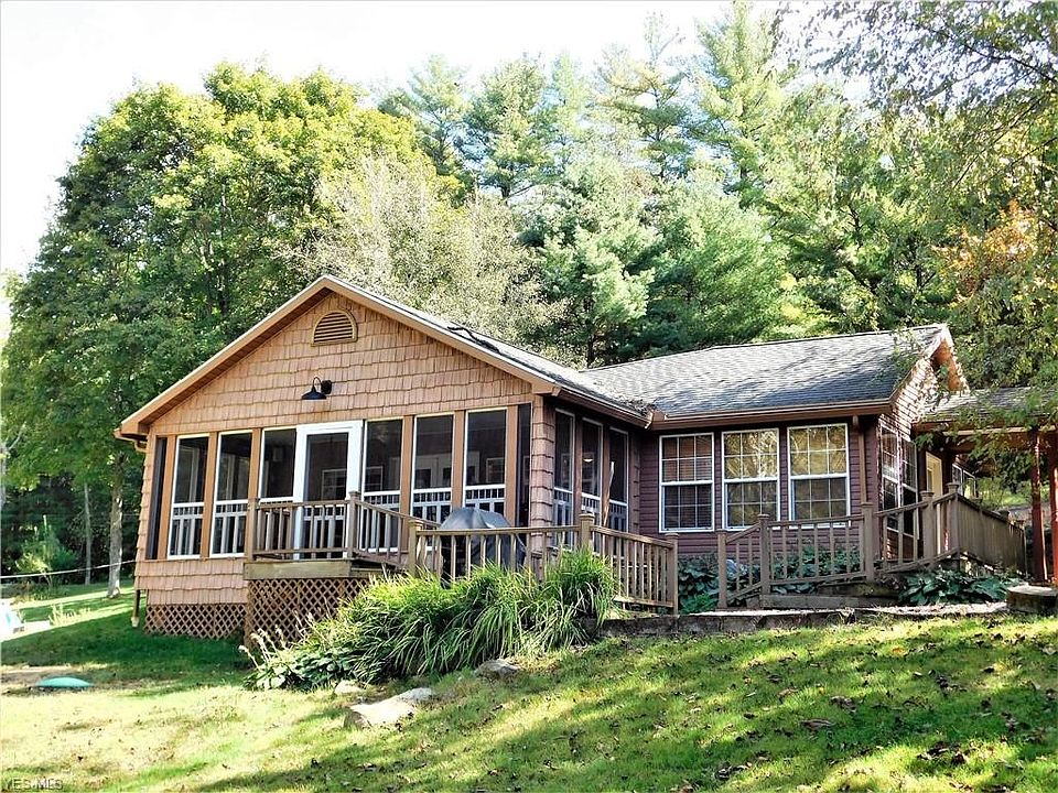 Lakefront living and a tranquil setting for this move-in ready home. Nestled in the trees of the Barnhouse allotment of Leesville lake, this custom cottage truly cannot compare. Walk through the front door into your elegant sun-room, ready for entertaining or office space, surround yourself with beautiful windows, and wood blinds. From there enter into your eat-in kitchen that comes with its own movable island. Spaced nicely so that it is attached to your living room and overlooks your large screened-in porch. Where you can watch the sun set over the water. The kitchen, living room, and master bedroom all have vaulted ceilings that are all tongue and groove. Cozy up by the fire in the living room, or in your master bedroom. From the outside of the property you have composite decking, walkways, retaining walls, and your own detached garage for the golf cart and workspace. Use your golf cart to drive down to your boat (2017 Manitou Angler) and enjoy some of Ohio's finest fishing. Year round living or weekend gateways this home will provide your needs.