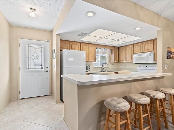 Delightful, maintenance-free, 2 bedroom, 2 bath end unit villa is now available in the beautifully manicured and popular 55+ community of Village Green. Upon entering this spotless home, you will immediately be impressed with the lovely tile on the diagonal in the main living areas. The tile goes all the way back through the enclosed lanai which was rebuilt/enclosed in 2018 with impact windows and easy-care honeycomb shades (shades installed in 2019). From the back of the home, enjoy the park-like greenbelt view, with community pool conveniently located just to the back-left of the home. This home includes a spacious one-car garage with laundry located in the garage. You won't have to worry about transitory neighbors, since no rentals are permitted in this section of Village Green. Reasonable monthly fee covers exterior painting, complete lawn care, irrigation, basic cable and internet, and the community pool. Section 3 of Village Green is pet-friendly, allowing one cat or dog with no weight restrictions. Ideal location, just a short drive to the sandy Gulf of Mexico beaches and close by shopping, medical facilities, restaurants, and more!