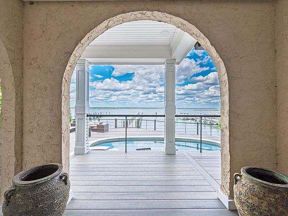 Spanish Elegance Meets Modern Luxury on the Bay! Step into this timeless Spanish-style bayfront home with 5 bedrooms, 3 fulls baths, every detail of this home has been thoughtfully cared for. This home is filled with character and craftsmanship blending timeless architecture with impeccable modern updates. Behind the custom arched wooden front door, a world of craftsmanship unfolds, from soaring archways and hand-finished woodwork to stone accents and rich hardwood floors. You’re welcomed into a grand entry where to the right is a private guest bedroom and to the left the garage entrance, laundry room, and full bath. Straight ahead, the showstopping art deco white staircase immediately sets the tone for this one-of-a-kind home. The home’s heart is its sunken living room, where a stone fireplace frames sweeping water views that stretch across your private deck, saltwater pool, and boat slips. Just steps away, the recently renovated kitchen features dark wood cabinetry, stone counters, and an oversized carved stone sink that feels more like art than function. Upstairs, each of the 4 bedrooms claim a view of the bay, with openings to private balconies. The en-suite master is a serene retreat, while custom solid wood doors, Restoration Hardware lighting, and thoughtful details that elevate every corner. Outdoors, sunsets steal the show, painting the sky in fiery hues while you lounge by the saltwater pool or entertain on the brand-new TimberTech deck and dock. The home, sold fully furnished with elegant décor, offers more than just a residence, it’s a lifestyle defined by elegance, comfort, and waterfront living at its finest. There is a lease with the state for the water rights at approx. $1600 a year.