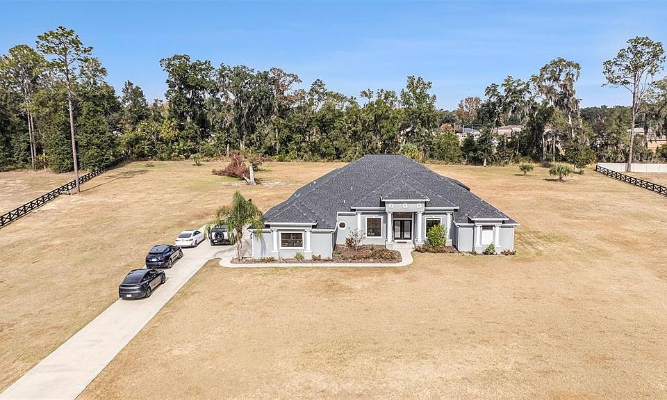 Welcome to a refined blend of luxury, comfort, and Florida countryside living. Tucked inside the highly sought-after, Elegant custom estates gated community of Summerhill, this exquisite Dream Custom POOL Home sits on 2.57 Equestrian-friendly acres and offers a modern, peaceful retreat just minutes from Ocala’s premier equestrian venues, shopping, dining, and medical facilities. Built in 2022, this meticulously designed 4-bedroom, 3-bath home showcases award-winning craftsmanship, thoughtful layout, and upscale finishes throughout its 3,563 sq. ft. of living space Interior Elegance & Modern Comfort .Step through the columned entry into a bright, inviting interior where natural light pours through large windows and glass doors. The open-concept great room features a gorgeous tray ceiling and triple sliders that fully open to the screened outdoor oasis and a formal dining area and a breakfast nook. Two flexible spaces— with double French doors—offer ideal options for a home office, playroom, or quiet retreat. The gourmet kitchen is a chef’s dream, complete with Large center island with bar seating, Quartz counter tops and backsplash ,Custom wood cabinetry, Stainless steel appliance suite, Abundant prep and storage space, Seamless connection to the great room and dining areas. The luxurious primary suite is intentionally secluded on one side of the home and offers, Tray ceiling & oversized sitting area , two Walk-in closet , Spa-style bathroom with dual tiled showers, Freestanding soaking tub, Double vanities & private toilet closet Resort-Style Outdoor Living spanning the entire rear of the home, the screen-enclosed lanai is designed for year-round enjoyment and entertaining. Overlooking peaceful pasture views, it features Saltwater pool with multi-tiered waterfalls ,Color-changing LED nighttime lighting ,Covered dining & lounging areas, Direct access from the great room via wide pocketed triple sliders .This serene setting offers unforgettable sunsets and ample room for family fun or quiet relaxation. Property Features a Generac whole-house generator, Luxury vinyl plank flooring, 3-car garage with oversized driveway , Large laundry room with utility sink , hard wire cameras , surround system prewire.