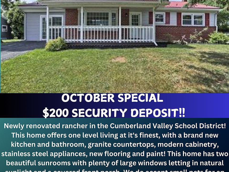 Newly renovated rancher in the Cumberland Valley School District! This home offers one level living at it's finest, with a brand new kitchen and bathroom, granite countertops, modern cabinetry, stainless steel appliances, new flooring and paint! This home has two beautiful sunrooms with plenty of large windows letting in natural sunlight and a covered front porch. We do accept small pets for an additional monthly fee! The rent is $1,799 plus $75 monthly utility fee which covers services for the well water and septic sewer. Tenant is responsible for lawn care, gas and electric. The heating in this home is propane gas heat. OCTOBER SPECIAL, $200 SECURITY DEPOSIT!! FREE APPLICATION FEE!! Application requirements - 550 credit score, 3x income, good landlord reference. Anyone 18+ must apply separately. *Unpaid eviction(s) and/or judgement may disqualify the application. For serious inquiries, please complete an application online at: https lbrproperties. Lease Terms 12 or 18 months Landlord pays for water, sewer and lawn care. 18 month lease. Pets permitted for additional monthly fee, with breed and weight restrictions.