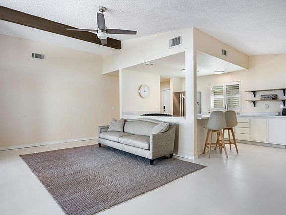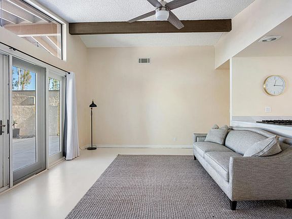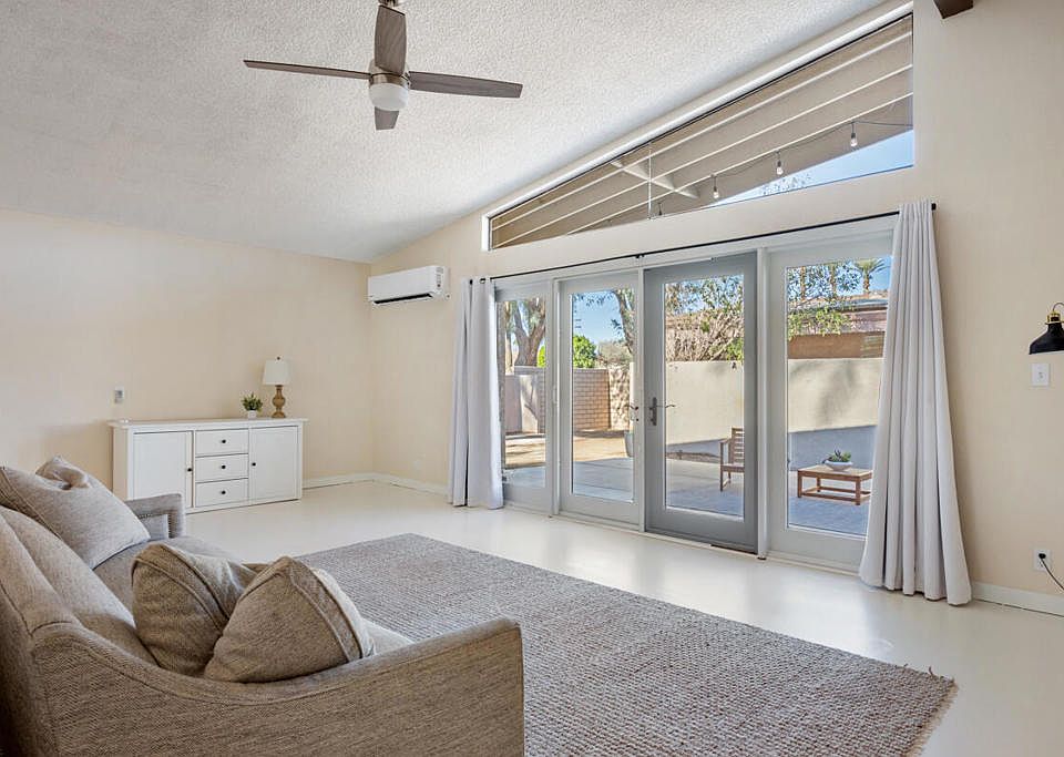 Move-in ready 2 bedroom/2 bathroom Portola Del Sol community home is ready for its new owner! This home is similar to a single family residence with no shared walls with neighbors - adding lots of privacy (only garage has shared wall). This single level home home features new Milgard windows, new mini split units, fresh paint, new countertops, new electrical plugs and switches, with a great floorplan layout, and gorgeous mountain views. The living room has a vaulted ceiling and new double french doors leading to the patio. The updated kitchen offers breakfast bar seating, white cabinetry and overlooks the living room and dining area. Both of the bedrooms have vaulted ceilings, and plenty of closet space. The primary suite also has a private slider to the patio and private ensuite with barn-door entry. There is also a hall bathroom for the second bedroom and guests to share. Enjoy the large private patio area with concrete and rockscaping - perfect for entertaining, there is also a large side yard area and beautiful mountain views to enjoy. Residents also have access to a heated pool + spa, there is also a 2nd soaking pool, and tennis courts! Conveniently located near shopping, dining, and all that Palm Desert has to offer!