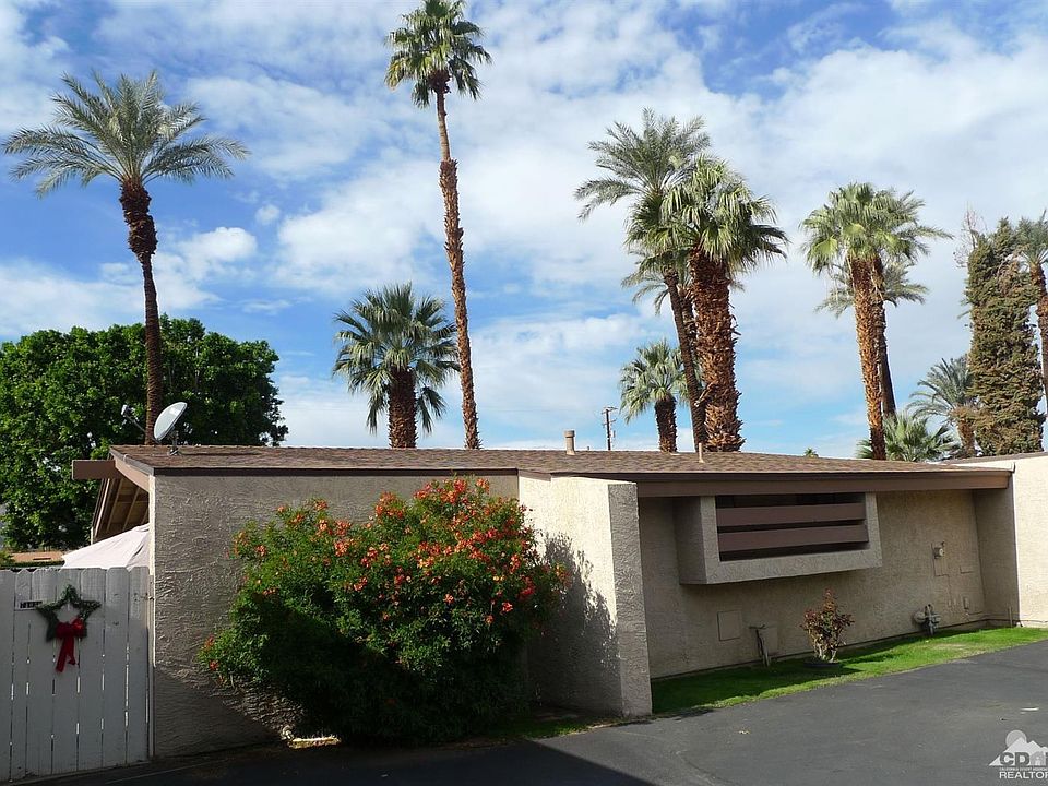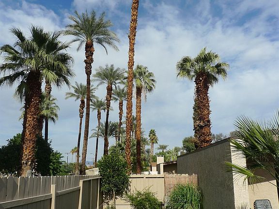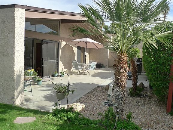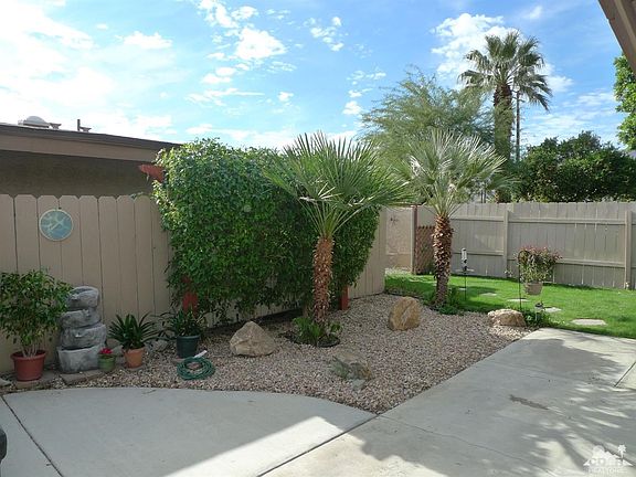 Immaculate, single story 2 bedroom, 2 bath condo offered turnkey furnished. Located in the popular and centrally located community of Portola Del Sol, this unit offers its own private yard and includes a south facing patio. Very light and bright and oh, so inviting. Two pools, two recently resurfaced tennis courts and low HOA dues of $340. The condo is ready for instant relaxation and enjoyment of all the desert offers. It sleeps 6 and is close to El Paseo, COD and all shopping. Very dog friendly patio and side yard. Solar installed, 24 panels Renova Solar 2017 with upgraded 200 AMP service panel. 18K BTU split AC in garage.