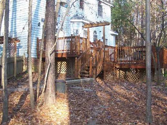 Northeastern Style home situated on 3.3 acres of land in a heavily wooded subdivision with large lots just minutes from Wake Forest. 3 floors, 2 car end on end garage adjoining finished basement. Two tier deck. Creek runs along the back property line. The ultimate in privacy. Neighborhood Description Quiet, wooded neighborhood with large lots. Just around the corner from Wake Forest shopping and restaurants.