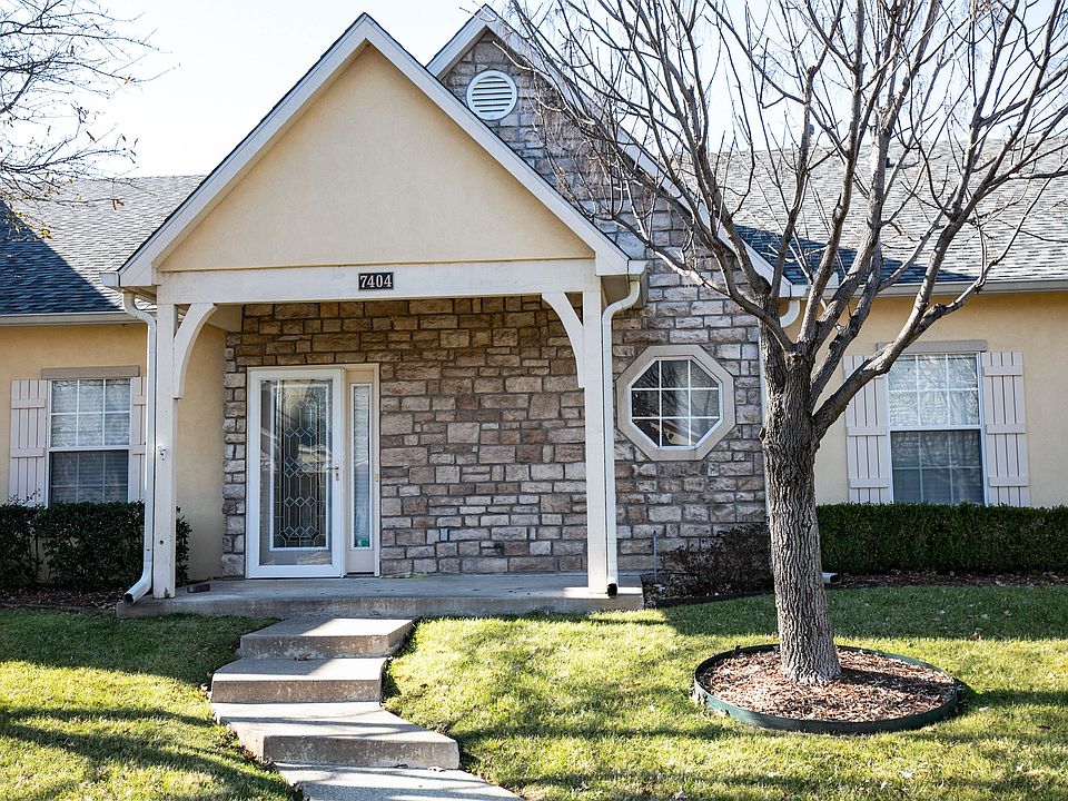 Feels new, 2 bed, vaulted ceilings, fireplace, sun porch. Washer, dryer & refrigerator included. Kitchen open to living. Attached rear entry garage. Nicely located in the back of the complex. New Roof!