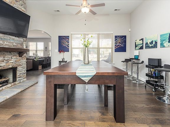 Stunning 4 bedroom situated on over 1/2 acre fenced lot. Entertainer's dream with open flowing floorplan. LR, formal DR. gorgeous kitchen with granite, stainless appl .and gas stove overlooks hearth room. You'll love the private, primary bedroom with added door leading to covered patio. Two other bedrooms downstairs in this split plan and a lovely office. 4th bedroom up could be bonus room. Soaring ceilings, beautiful hardwoods, 2 fireplaces, and stylish lighting make this a dream home.