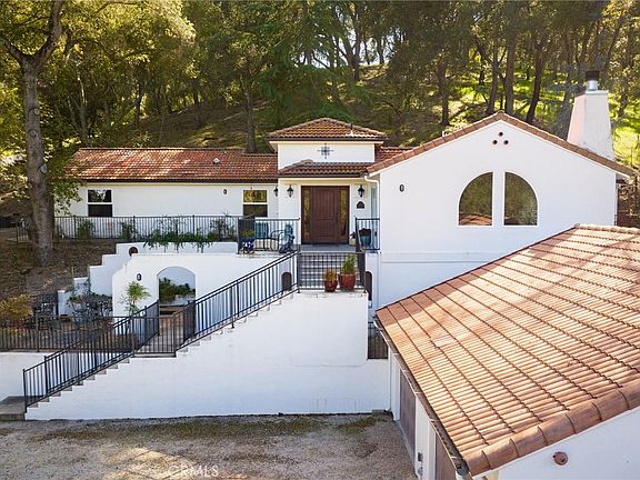 INTRIGUING ABODE! Gorgeous Spanish style home featuring 2935 sf, 3 bedrooms and 3 bathrooms on 1.88 oak studded acres. The home sits on a corner lot perfectly melting into the hillside and blending into the majestic oaks. Steps gracefully lead you up to the front door and as you enter you are wrapped in warm European elegance. The engineered hardwood floors stretch through the living room which draws your eyes upwards to the wood beam ceiling then down to the corner wood burning fireplace with curved wall and side seats. The living room flows effortlessly into the dining area then into the divine kitchen. The sophisticated kitchen boasts top of the line stainless steel appliances, granite countertops and Saltillo tile floors. The primary suite is in a wing of it's own and offers engineered hardwood floors, large walk in closet and luxurious ensuite bathroom. The ensuite features a double sink granite countertop vanity and massive walk in shower with dual showerheads. Downstairs there is another living area with built in wet bar and bathroom. Outside is a paradise with quaint private patios to enjoy the splendid property. While exploring the grounds you will come across the self-contained and climate control wine cellar! It's ideal for any wine enthusiast. The grounds have wonderful walking trails that take you all over the property. You'll find the many fruit trees and even a fenced garden area. The double driveway allows for guests to easily park and there's plenty of room for an RV or trailer! This is a once-in-a-lifetime home, hurry before someone else snags it! Please view the Virtual Tour for additional information including room dimensions.
