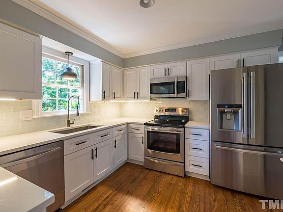 Completely remodeled home from top to bottom in wonderful N. Raleigh location. New kitchen features wht shaker cabinets, quartz counters, SS Pro appliances, including NEW fridge! All new Baths! Beautiful Site finished hrdwds on main level. Family w/Wood FP. Formal Dining. Back stairs to Big bonus rm. New paint inside and out, New roof, New HVAC systems. Finished/insulated garage w/ epoxyed flr. Oversized tiered decking overlooking the Level fenced yrd & garden area. Sure to impress-See Video Walkthrough