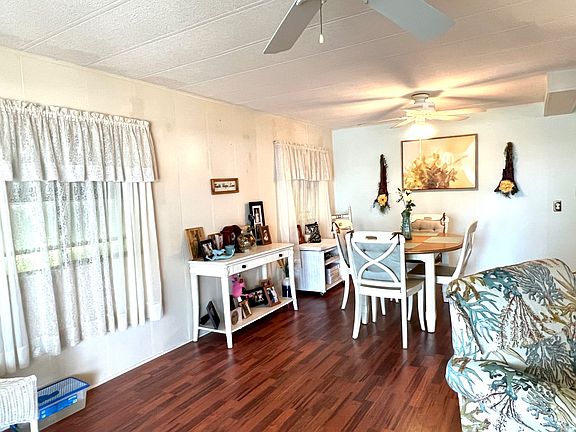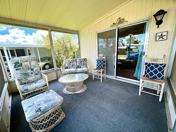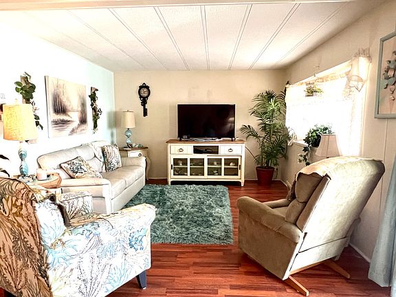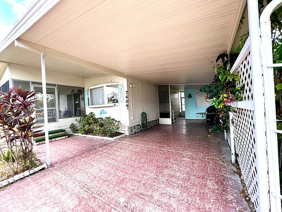 7406 Morningside Dr N is on the North Side of Colony Cove, a 55+ pet friendly, land lease community. SATISFACTORY 4 Point Inspection done on August 3 will be provided to buyer! This home is a clean canvas waiting for you to paint your new Florida lifestyle in this award winning community with an abundance of amenities. This is not just a place to live; it is a lifestyle! The home is available immediately upon community acceptance! It is sold furnished and turnkey including Tommy Bahama living room furniture and a nice TV that is already connected to an antenna for free TV programming. The home has had continuous pest control for a bug free environment. The previous owners did not have pets and were smoke free. Home is located on a quiet, low traffic side street. LIVING AREA: Nice size L shaped living room with 2 big bay windows. Beautiful laminate flooring throughout the main living area! Comfortable/clean high quality furniture stays with the home! LANAI: Just through the sliding glass door off the living room is a front set screened lanai where you can enjoy your morning coffee or relax all day. It is a great place to watch the world go by and wave to your new friends and neighbors. Just outside the lanai is another covered outdoor seating area! KITCHEN: The entrance from the carport is into the kitchen. Bringing in groceries is a breeze from the covered carport! There are ample upgraded cupboards and countertops including a nice size pantry. Nice appliances as seen in pictures are included! There is a stainless steel sink with ceramic backsplash. DINING ROOM: It is conveniently located beside the kitchen. Spacious enough for a large table & chairs. Large MASTER BEDROOM: Bay window, a double closet and it is carpeted. En-Suite Master Bath has single bowl vanity, water closet & step-in shower adjoined. COMFORTABLE GUEST BEDROOM: Bay window, a nice size closet and has carpet. GUEST BATH: Guest bath is easily accessible from living area and kitchen with a single sink vanity, water closet, full tub with shower for those that like to shower or soak. A partial second screened lanai is possible with only one wall needed to complete it right off the carport. There is usually a fresh cool breeze to enjoy your days outdoors in comfort! LAUNDRY/SHED: Washer & dryer included ~ with plenty of storage left over! The driveway can accommodate several cars and a golf cart! There are outdoor power receptacles and water spigot. That is not all! There is second 8 x 10 shed just behind the carport and first shed. It has its very own auxiliary air conditioner. The previous owner used it as an office but it is also ideal for a man cave or she shed! Home has been maintained: 2022: New Eaton main electric panel with GFI, home was power washed. 2019: A new membrane roof and a new hot water tank; 2016 new Air Conditioner and floors! The land lease is $982.19 that includes a full schedule of things to do and an abundance of amenities. Florida is a NO personal income tax state saving you thousands! Lawn care & 24/7 courtesy patrol gives you the ability to come & go as you please. You will love the quiet low traffic neighborhood with one of the 6 community pools within a short walk. GOLF CART & PET FRIENDLY: (2 dogs up 75 lbs each/breed restrictions). FISHING, BOATING & KAYAKING: Direct access to the Gulf of Mexico from the community Marina on the Manatee River (boats slips for nominal fee). Free fishing pier in the community or visit the Sunshine Skyway Bridge or Anna Maria Island Fishing Pier BEACHES: 7 miles of free parking at beaches that are about 15 miles away.