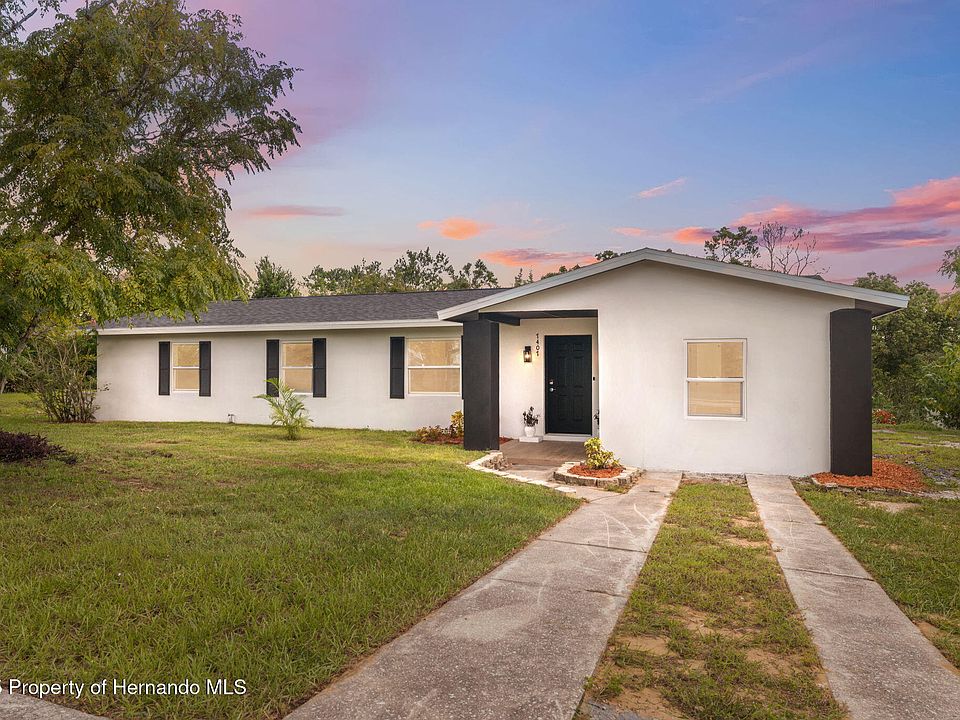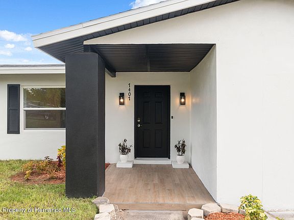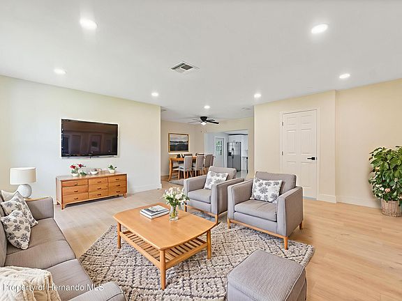 One or more photos has been virtually staged. Newly remodeled with a brand-new roof replaced in July 2025, this inviting 4-bedroom, 2-bath home offers modern updates and timeless comfort from the moment you arrive. The front covered porch welcomes you inside where fresh paint and new light wood-look vinyl plank flooring flow seamlessly through the living room, dining area, and kitchen. The kitchen is a bright focal point with white cabinetry, stone counters, tile backsplash, and stainless steel appliances, and it opens directly to the rear covered porch, perfect for enjoying your morning coffee or winding down in the evening. Both bathrooms have been thoughtfully renovated, with the primary ensuite showcasing dual vanities, large marble-look tile, a step-in shower with rain shower head and additional sprayer, and crisp, clean finishes. The guest bath carries the same elegant design with a single vanity. A converted garage adds flexibility for use as a third bedroom, office, or fitness space. Outside, the fenced backyard with mature trees provides a sense of privacy, while sidewalks out front make daily strolls easy and enjoyable. Conveniently located, Weeki Wachee Springs State Park, known for its crystal-clear springs and wildlife, is just 6 miles away, Pine Island Beach with its breathtaking sunsets is 11 miles away, and the Suncoast Shopping Center is only 5 miles away for dining and shopping needs. Best of all, the Suncoast Expressway is 10 miles from the property, offering a direct and efficient route into Tampa and surrounding areas, making commuting for work or play stress-free. This home blends modern style, function, and location to create a place that feels move-in ready and truly special.