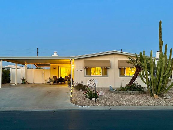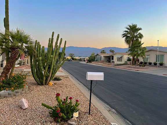 This charming and comfortable two-bedroom, two-bathroom turnkey home is located in Palm Desert Greens Country Club, one of the nicest and most popular 55+ communities nestled in the heart of the desert. You OWN the LAND! Low $355 monthly HOA fee includes FREE Golf, Cable TV, Wifi, trash removal, and 24/7 Guard Gate Security. As you step through the elegant beveled glass front door, you'll be greeted with glamour and warmth and stunning mountain views from the front living area. The bright kitchen features updates, as well as a breakfast bar for morning chats. The TV room features a stunning fireplace and wet bar. There's plenty of storage throughout, including two master closets, one being a walk-in, a walk-in closet in the guest bedroom. The home is partially dry-walled and features double-pane windows. The backyard boasts new vinyl fencing for added privacy and security. Additionally, the property features a host of recent upgrades, including a new HVAC system with a heat pump, a new roof, and new Pella windows and a Pella Slider Patio door for energy efficiency and aesthetic appeal. The community also boasts 3 swimming pools, tennis courts, pickleball courts, bocce ball, an indoor shuffleboard court, basketball court, a Club House with restaurant and bar, along with many clubs and organizations to keep you active and engaged. A permanent foundation already installed and the 433a recorded, this property won't last long!